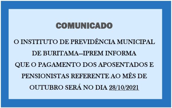 O INSTITUTO DE PREVIDÊNCIA MUNICIPAL BURITAMA—IPREM INFORMA QUE O PAGAMENTO DOS APOSENTADOS E PENSIONISTAS REFERENTE AO MÊS DE OUTUBRO SERÁ NO DIA 28/10/2021